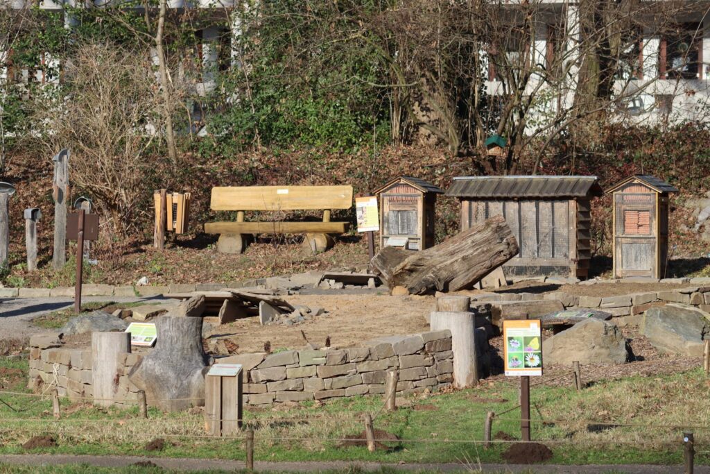 Die Besuchenden finden Bienenstöcke, ein Sandarium und zahlreiche Nisthilfen auf dem Gelände. Ein besonderes Erlebnis bietet der Bienenbaumparcours: Sogenannte Trachtbäume, die besonders viel Nektar und Pollen liefern, sind mit nummerierten gelben Holzwaben markiert. Eine Legende am Bienenhaus verrät, welche Zahl zu welcher Baumart gehört – perfekt für eine kleine Rallye, bei der Familien die Bäume erraten und dabei jede Menge Spannendes über Bienen erfahren.