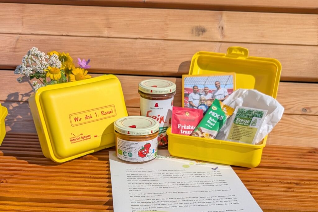 Zum Start des Schuljahres erhalten alle Erstklässlerinnen und Erstklässler eine eigene Brotbox. Sie ist gefüllt mit frischem Brot, Streichkäse, Müsliriegel und Tee. Für die ganze Klasse gibt es zudem Marmelade und Gemüsestreichcreme. Nach dem Packen werden die Boxen von ehrenamtlichen Helferinnen und Helfern vor der Frühstückspause an die Schulen verteilt.